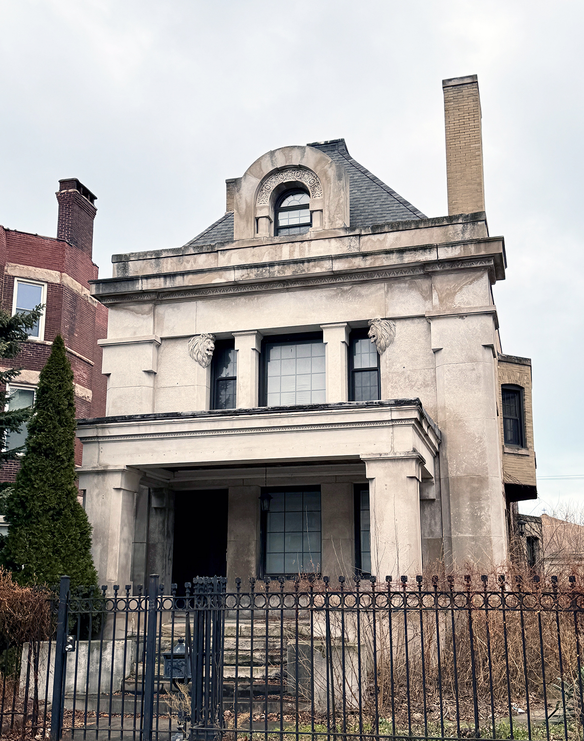 For a building cost of $20,000 (nearly $700,000 in 2025 dollars), Maher produced a Prairie School masterpiece, a tan brick structure covered in smooth gray limestone. The house included a wide front porch, a distinctive arched dormer, two lions squaring off near the second-floor windows, and a decorative iron fence enclosing the property. The house’s design displayed Maher’s interest in “combining aspects of both traditional and modern architecture through its symmetry, grandly scaled yet starkly simple facade, visually bold use of limestone and unusual ornament. … Its visual simplicity and dignity … gives the building a great sense of presence.”2